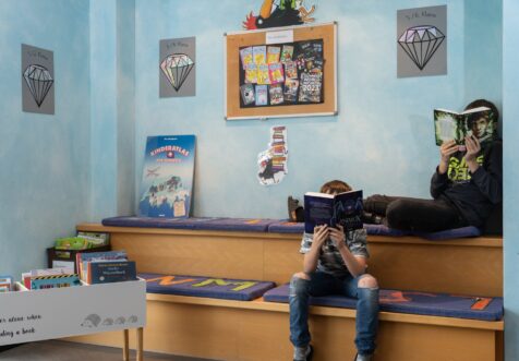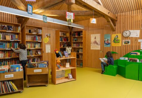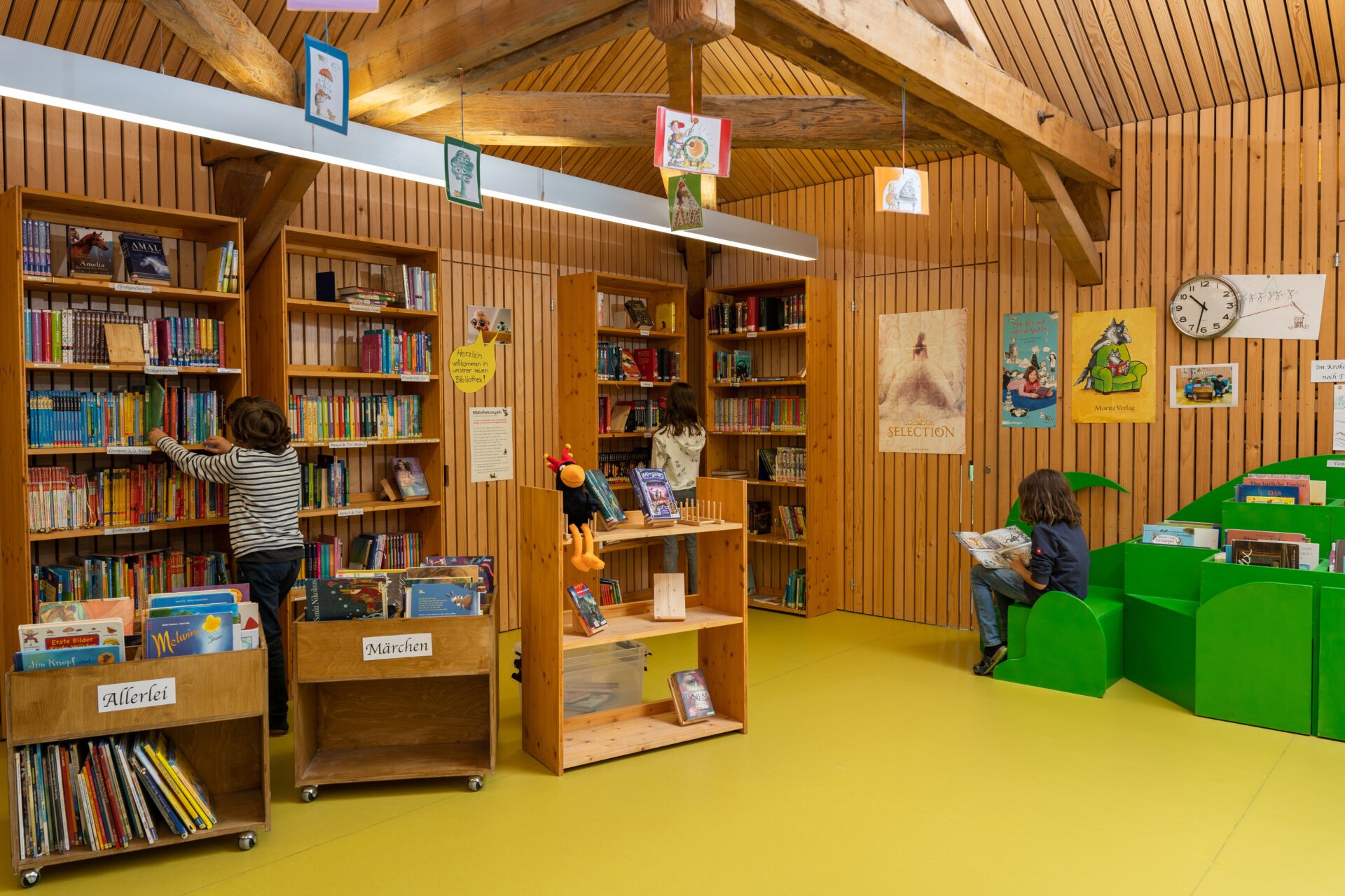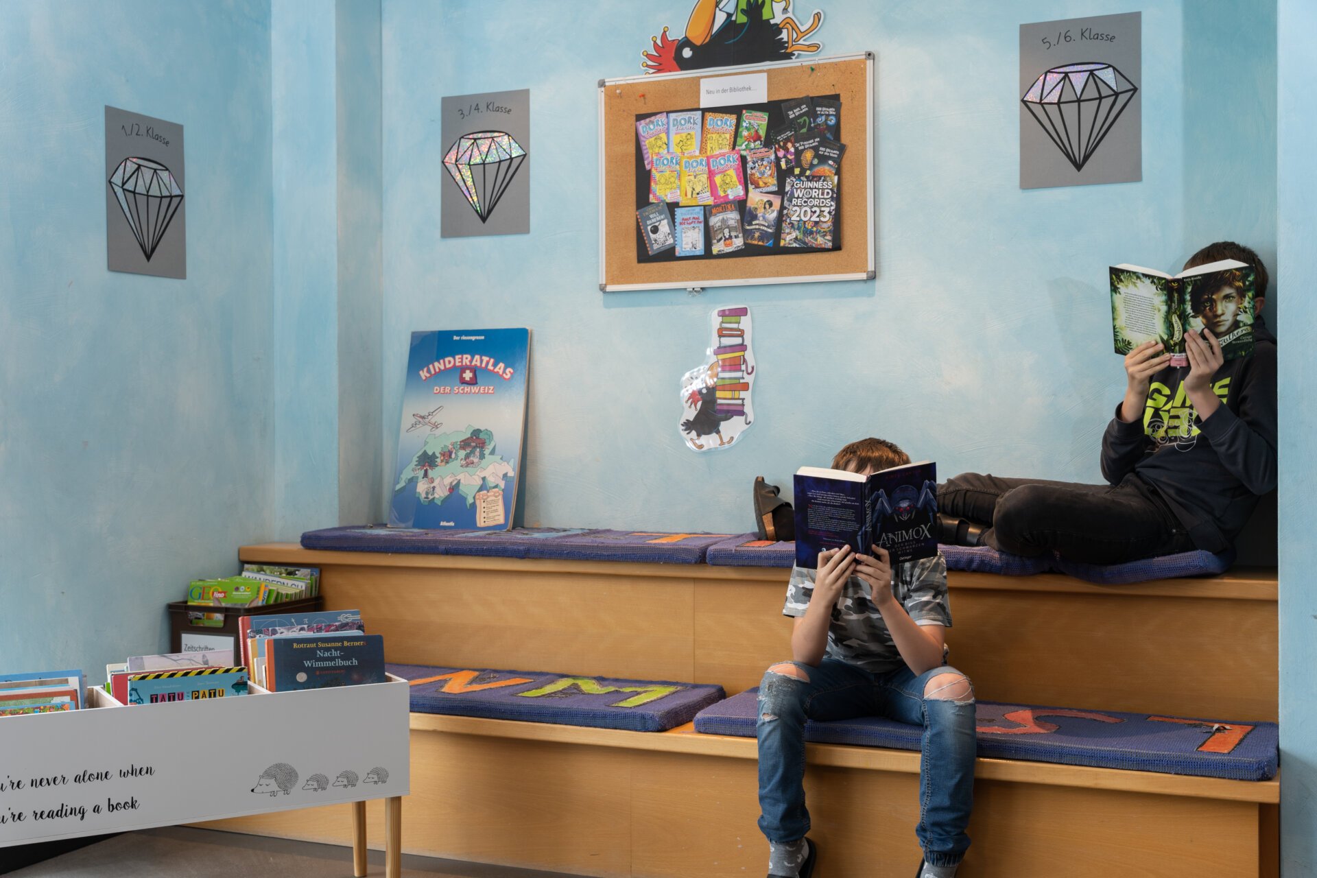 An beiden Schulstandorten befinden sich gemütliche Bibliotheken mit aktuellen Medienbestände. Eine zeitgemässe, digitale Ausleihsoftware ermöglicht die Zusammenarbeit und den Austausch der beiden Standorte.